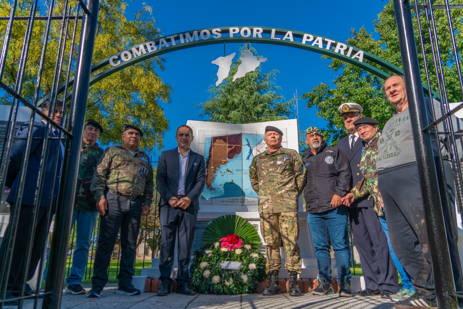 El intendente Sebastián Abella y excombatientes encabezaron la conmemoración y depositaron dos ofrendas florales: una en la previa al acto, en el monumento ubicado en la plaza Eduardo Costa; y durante el acto, bajo el Pucará.