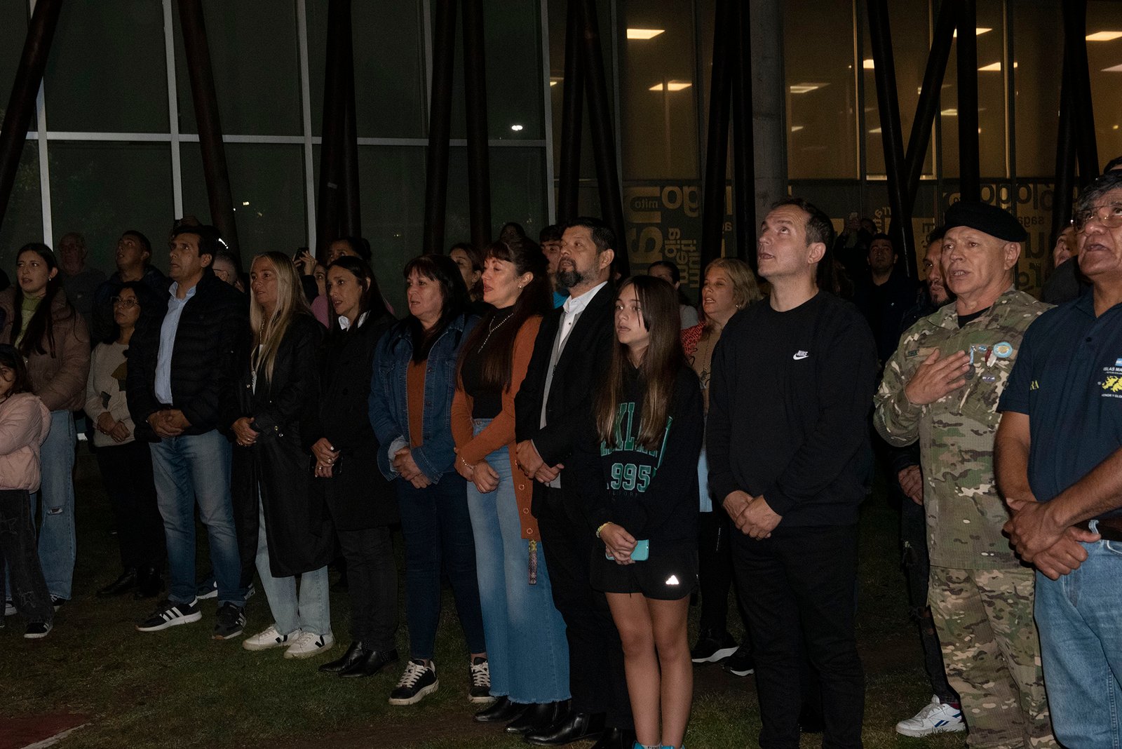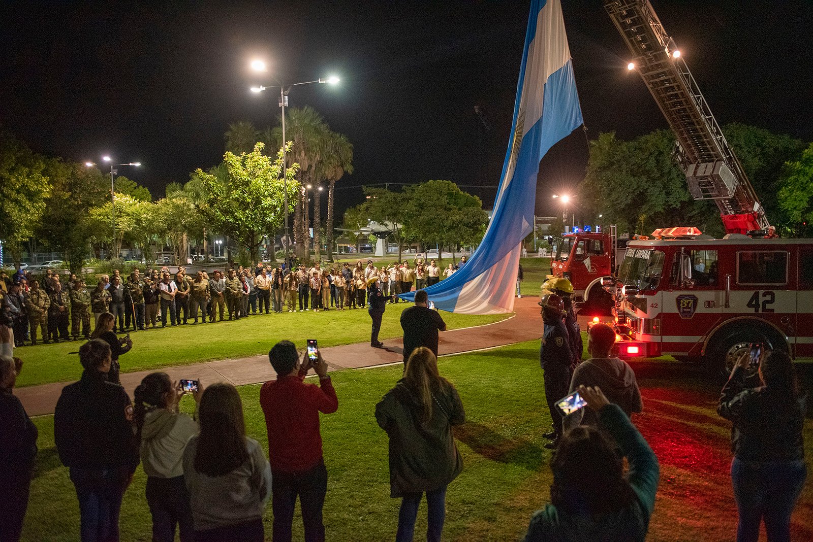 El final de la Vigilia, sobre la medianoche, resultó el momento más emocionante, con el izamiento de la bandera argentina hacia lo más alto de la noche en la escalera mecánica de uno de los móviles de Bomberos Voluntarios de Campana.