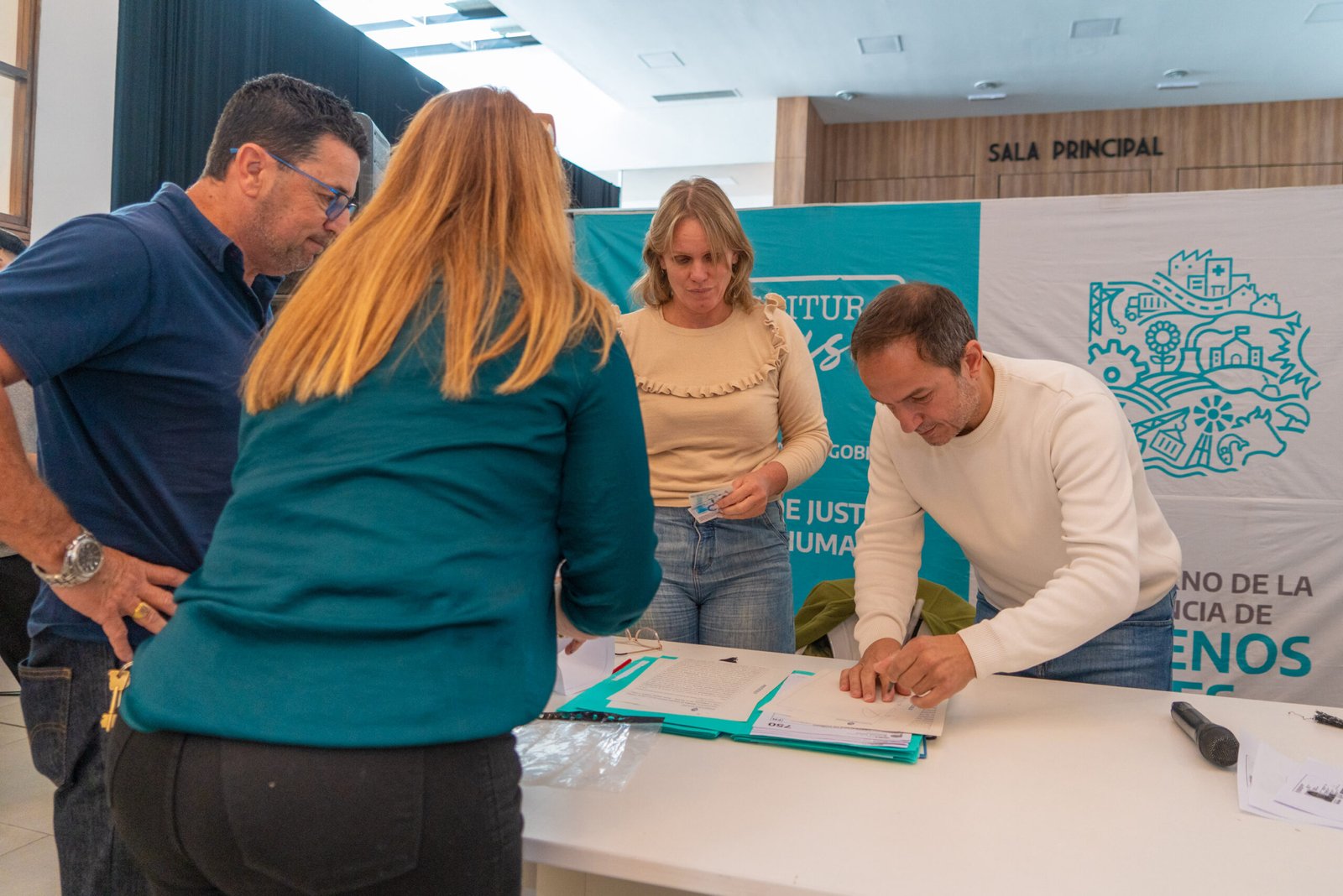 Las firmas se realizaron en el marco de la Ley Provincial 10.830, en un trabajo articulado entre el Municipio y la Escribanía General de Gobierno de la provincia de Buenos Aires para la obtención definitiva de los títulos de dominio.