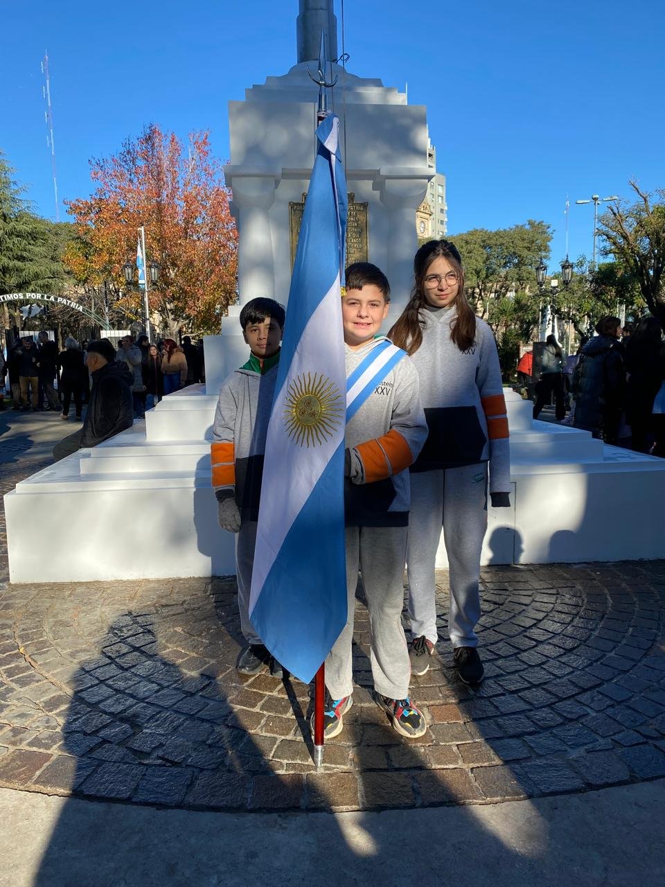 Los alumnos del Colegio Albert Einstein participaron del acto del Dia de la bandera que también formó parte del histórico evento de reinauguración del mástil central de la plaza Eduardo Costa.
