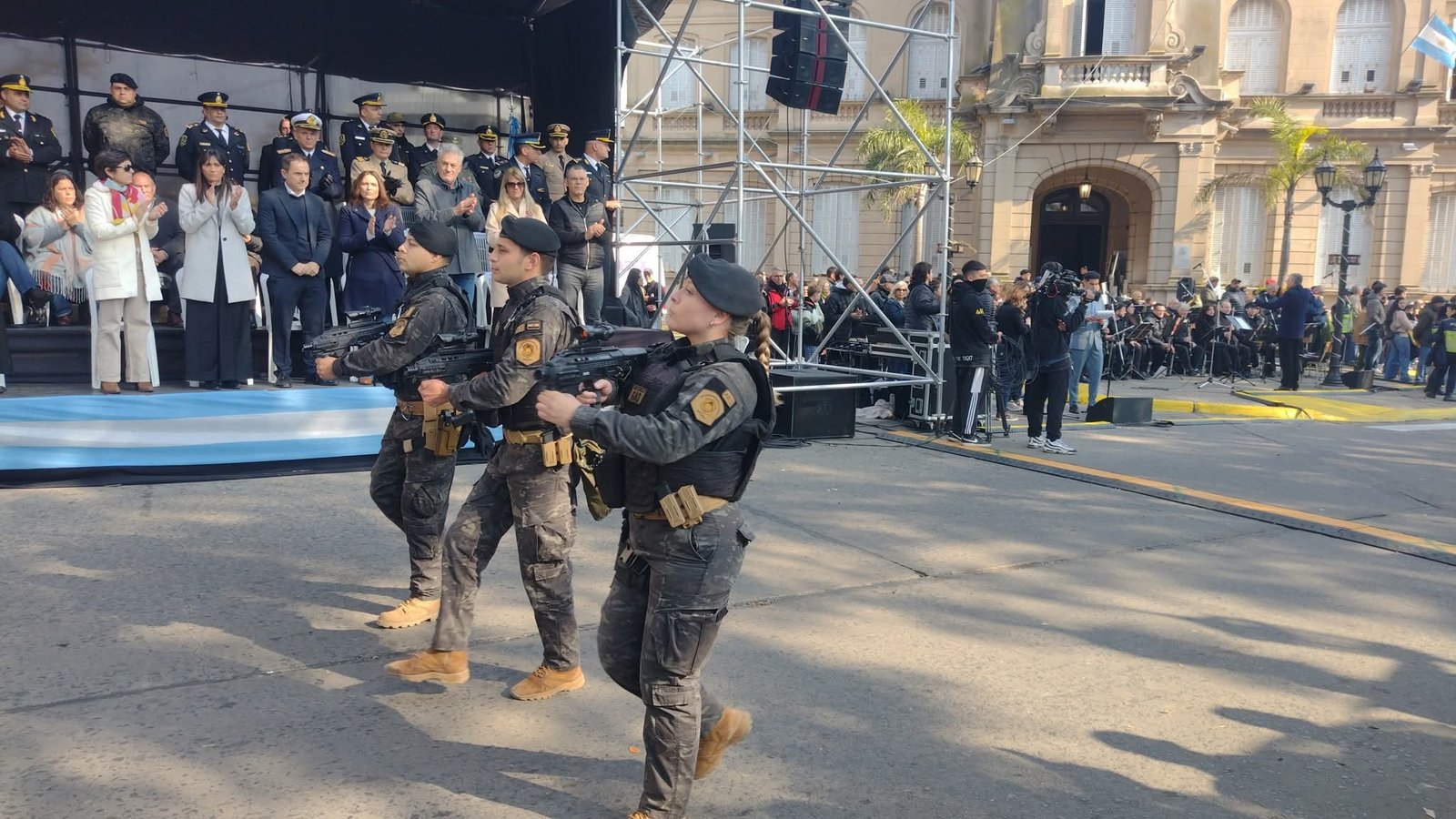 Luego fue el turno de las fuerzas de seguridad: Armada Argentina, Gendarmería Nacional, Policía Federal Argentina y Policía de la Provincia de Buenos Aires, con un cierre acrobático a cargo de las motos y los integrantes de la Brigada Blanca.