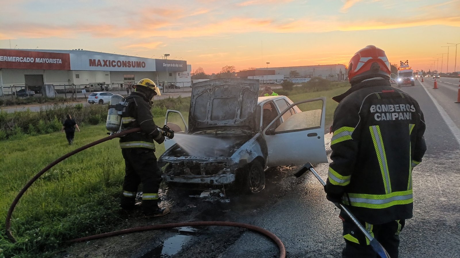 La pareja que viajaba en el vehículo logró salir al percatarse que salía fuego del motor y luego con la ayuda de matafuegos de transeúntes intentaron extinguir las llamas pero avanzaron rápidamente.