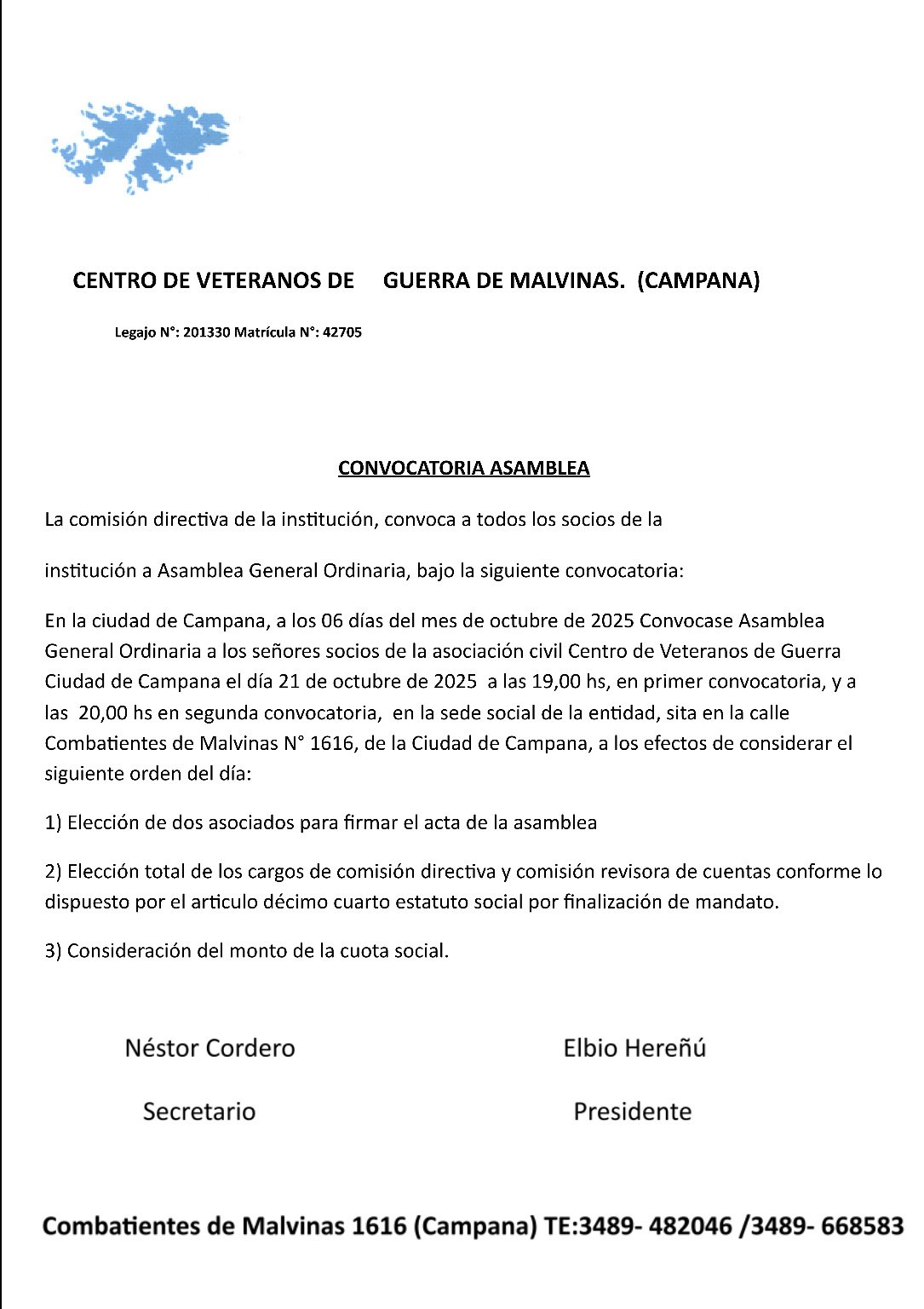 Centro de veteranos de guerra de Malvinas (Campana): Convocatoria a Asamblea General Ordinaria a. ultimas noticias Convocatoria/edictos 6 de octubre de 202529 de octubre de 2025mariano