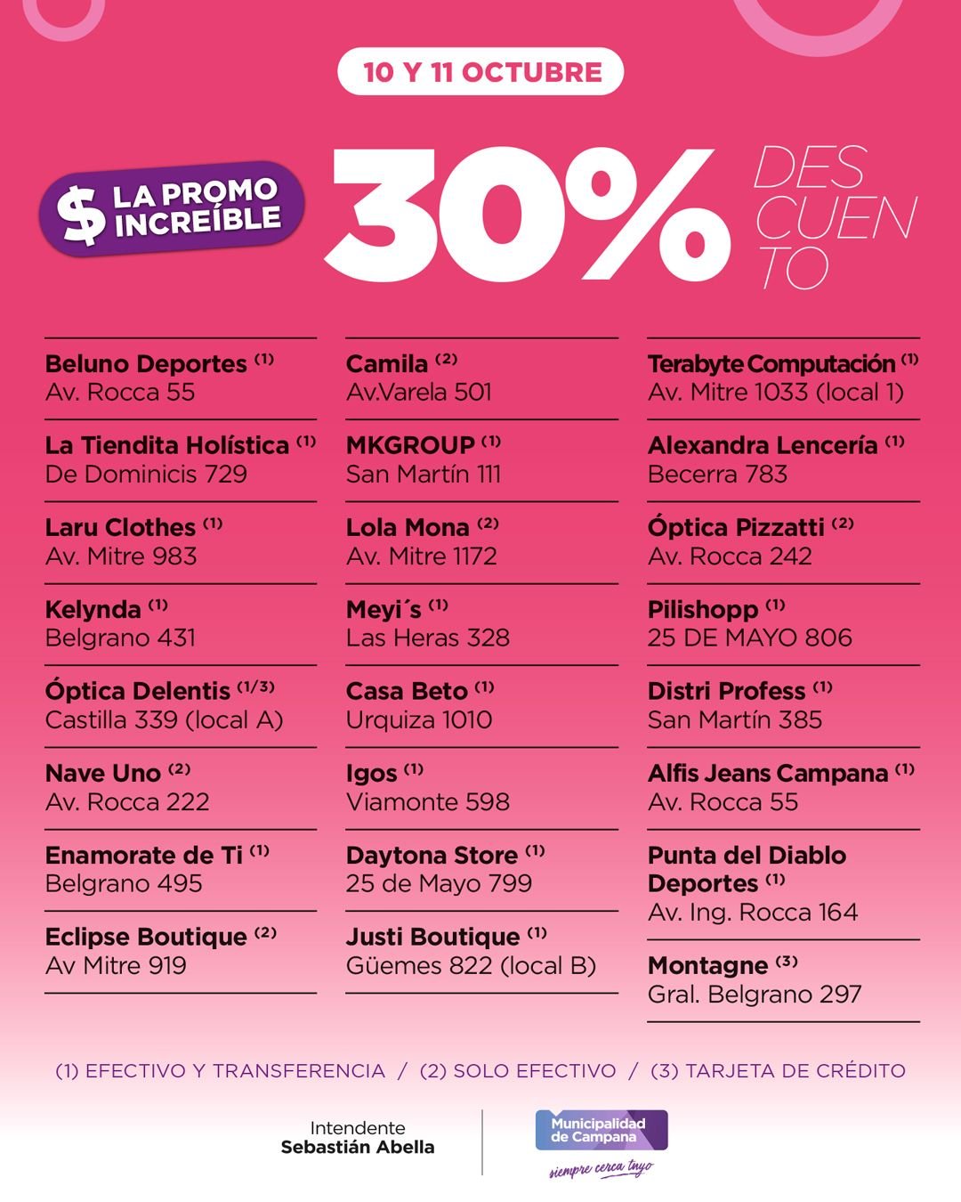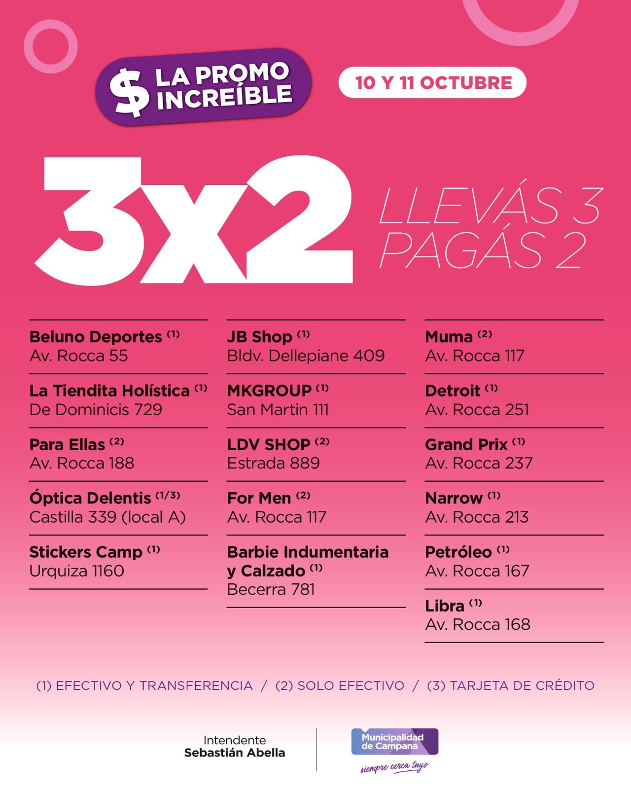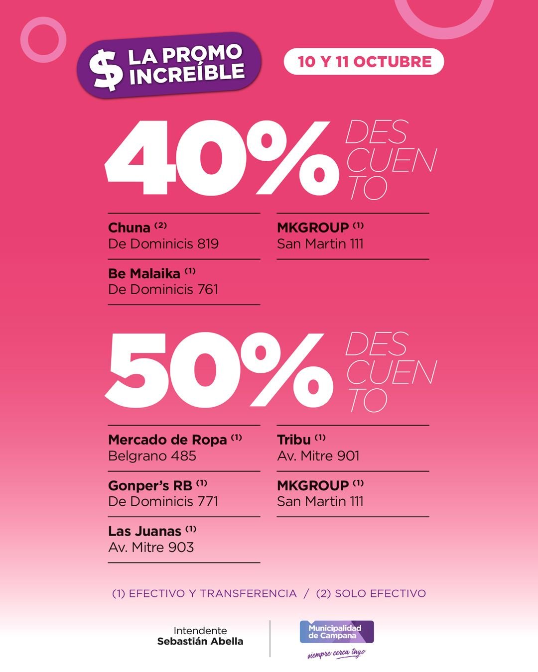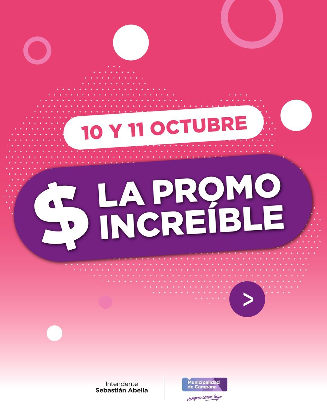 Con el objetivo de seguir impulsado el comercio local y brindar beneficios a los vecinos, el Municipio extiende este viernes 10 y sábado 11 de octubre la propuesta “La Promo Increíble” a locales de distintos rubros de la ciudad.