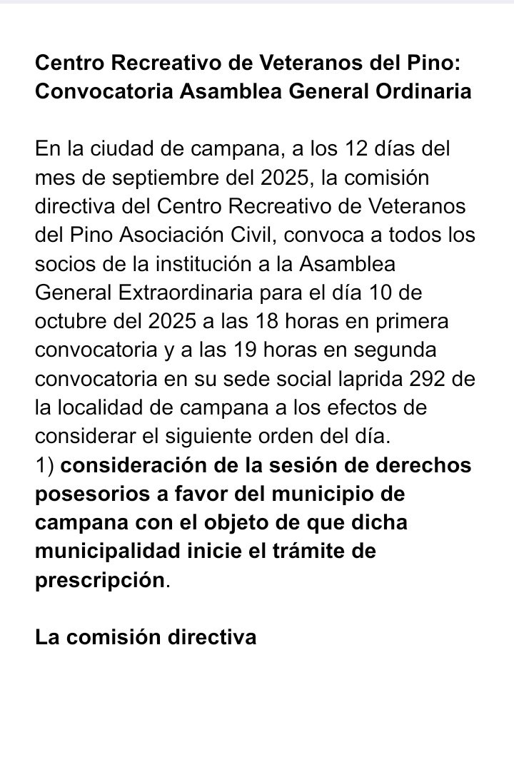 Centro Recreativo de Veteranos del Pino: Convocatoria Asamblea General Ordinaria a. ultimas noticias Convocatoria/edictos 8 de octubre de 20258 de octubre de 2025mariano