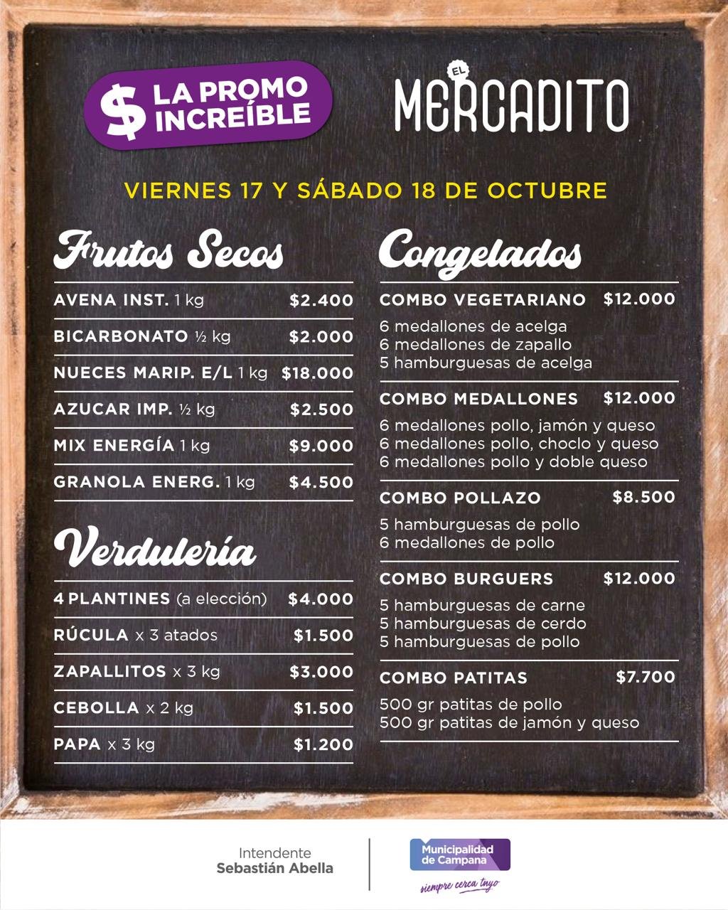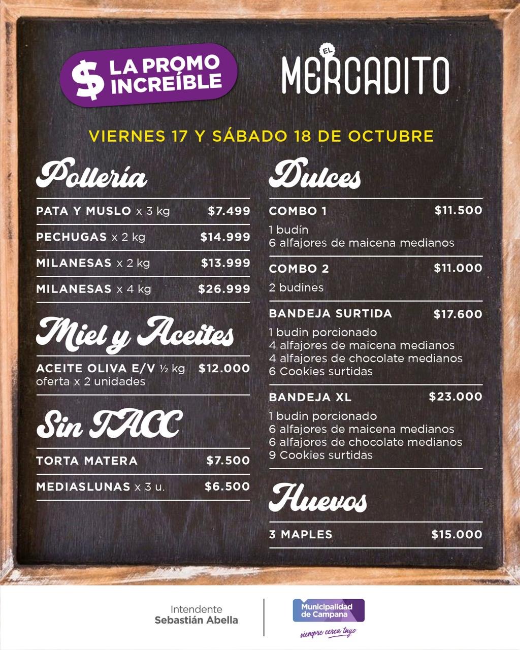 La Secretaría de Desarrollo Económico del Municipio informa que este viernes 17 en la Plazoleta Belgrano y el sábado 18 en la Plaza España estará nuevamente El Mercadito de Campana con “La Promo Increíble”.