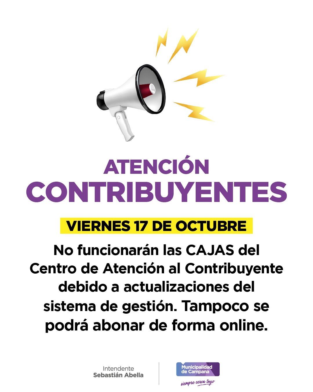 El Municipio informó que este viernes 17 de octubre las cajas del Centro de Atención al Contribuyente no atenderán al público debido a tareas de actualización y mantenimiento del sistema.