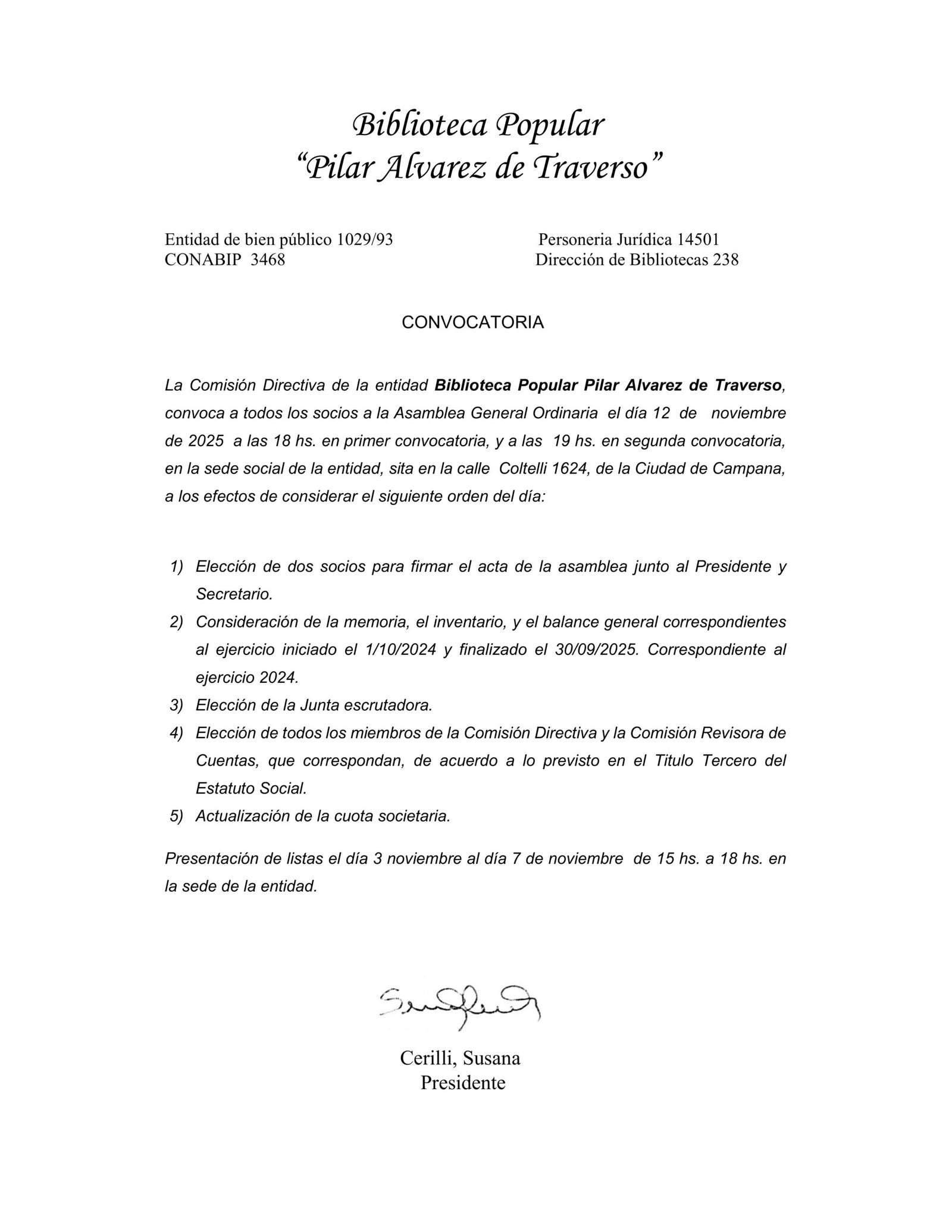 Biblioteca Popular “Pilar Alvarez De Traverso”: Convocatoria A Asamblea General Ordinaria De Socios