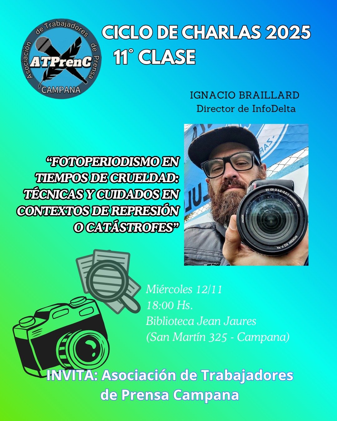 El próximo miércoles 12 de noviembre disertará Ignacio “Nacho” Braillard (director de Infodelta), quien hablará sobre el “Fotoperiodismo en tiempos de crueldad: técnicas y cuidados en contextos de represión o catástrofes”.