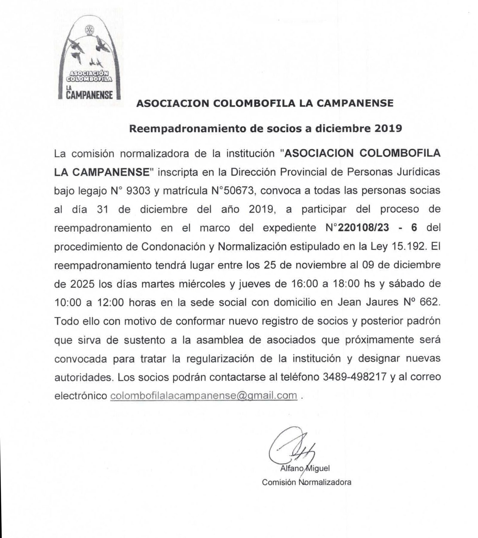 Asociación Colombófila La Campanense: Reempadronamiento de socios a diciembre 2019 a. ultimas noticias Convocatoria/edictos 17 de noviembre de 2025mariano