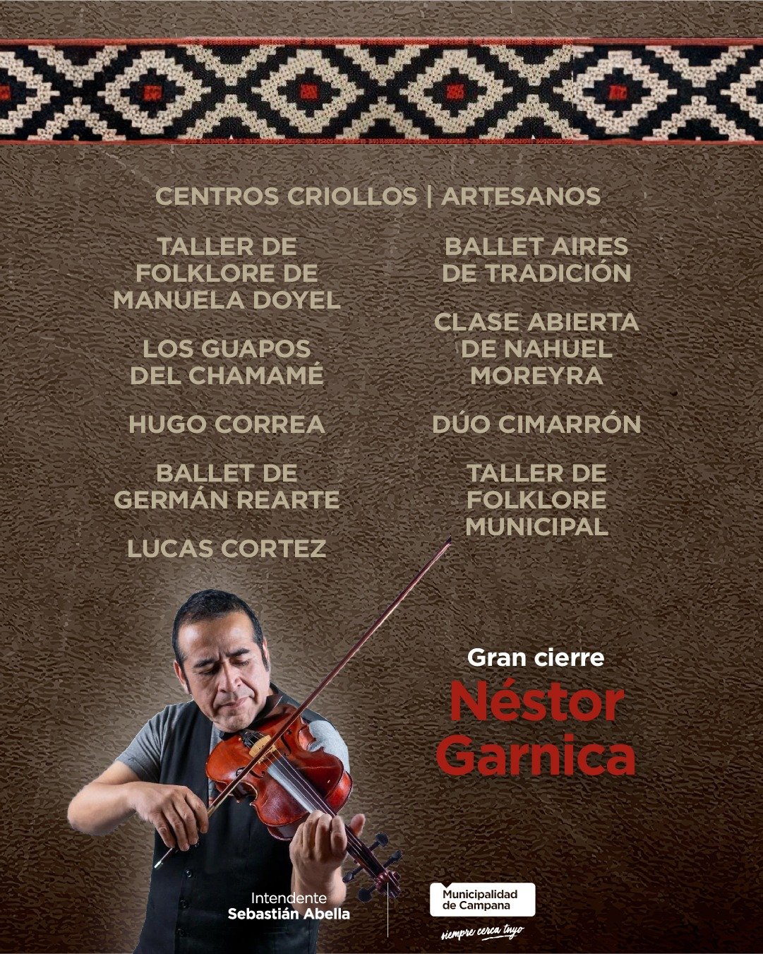 Los encargados de ponerle música a esta peña serán Hugo Correa, Lucas Cortez, Los guapos del chamamé y Dúo Cimarrón, mientras que el gran cierre estará a cargo de Néstor Garnica, uno de los artistas más reconocidos del folclore nacional, cuya presentación está prevista para las 19:30.