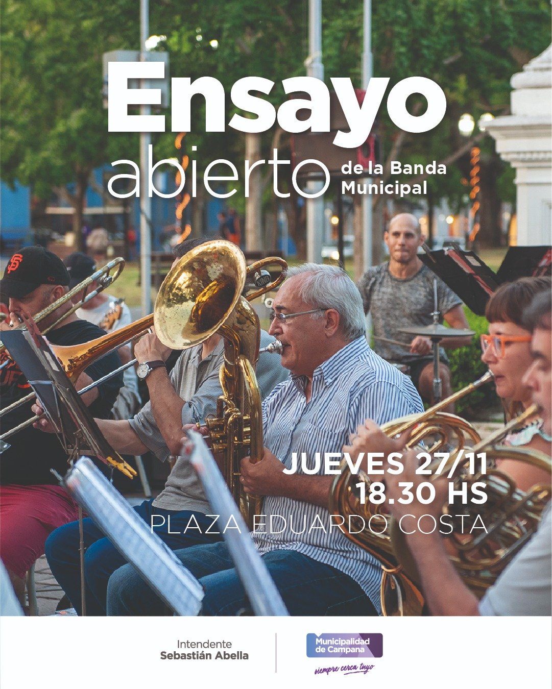 La Secretaría de Inclusión, Educación y Cultura invita a los vecinos a disfrutar de un nuevo ensayo abierto de la Banda Municipal de Música, que se desarrollará desde las 18:30 horas en la Plaza Eduardo Costa.