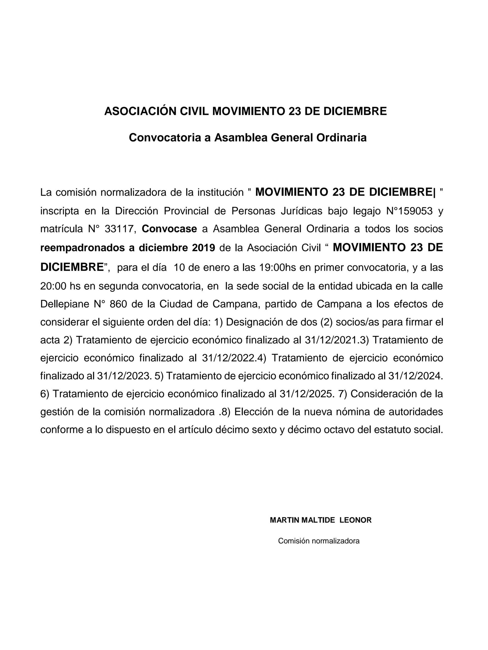 Asociación Civil Movimiento 23 de Diciembre: Convocatoria a Asamblea General Ordinaria a. ultimas noticias Convocatoria/edictos 23 de diciembre de 2025mariano
