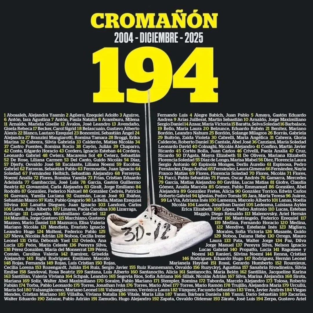 El 30 de diciembre de 2004 quedó marcado para siempre en la historia argentina. Aquella noche, durante un recital de la banda Callejeros en el boliche República Cromañón, un incendio provocado por una bengala encendió materiales inflamables del techo y desató una de las peores tragedias no naturales del país. El saldo fue devastador: 194 personas murieron y más de 1.400 resultaron heridas, muchas de ellas con secuelas físicas y psicológicas que perduran hasta hoy.