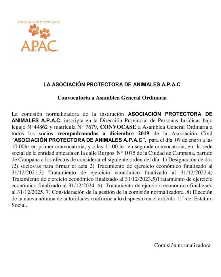 Asociación Protectora de Animales Campana: Convocatoria a Asamblea General Ordinaria