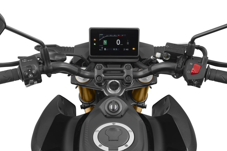 En materia de seguridad y ciclística, incorpora horquilla invertida Showa de 118 mm de recorrido, frenos a disco en ambas ruedas con ABS de doble canal y pinzas Nissin, garantizando mayor estabilidad y confianza en todo tipo de condiciones.
