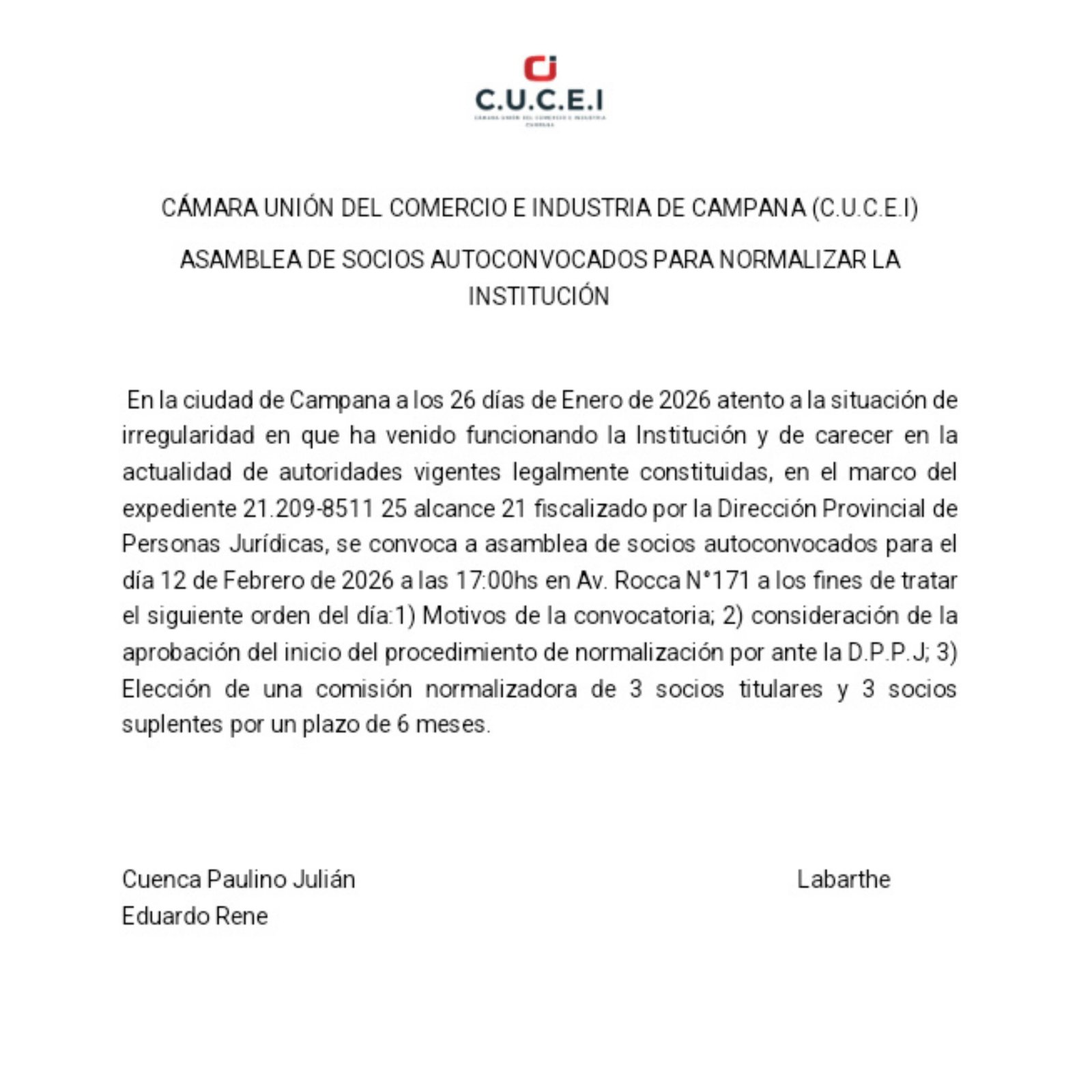 CÁMARA UNIÓN DEL COMERCIO E INDUSTRIA DE CAMPANA (C.U.C.E.I): ASAMBLEA DE SOCIOS AUTOCONVOCADOS PARA NORMALIZAR LA INSTITUCIÓN a. ultimas noticias Convocatoria/edictos 27 de enero de 202626 de enero de 2026mariano