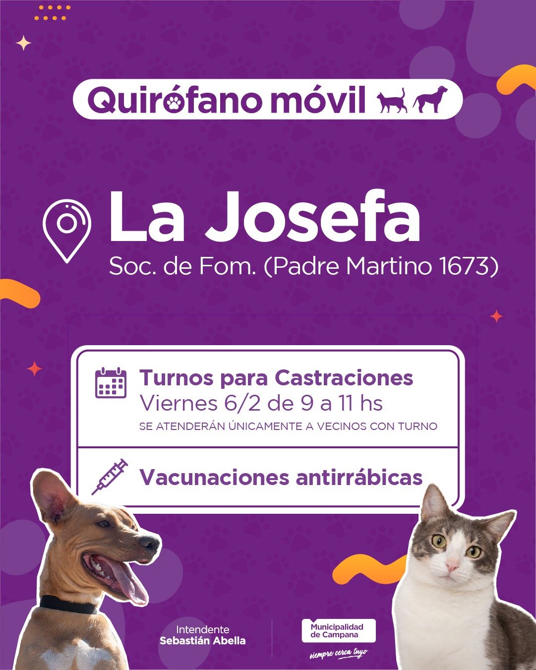 La Dirección General de Calidad Ambiental, Bromatología y Zoonosis del Municipio llevará el quirófano móvil al barrio La Josefa para realizar castraciones y vacunación antirrábica de manera gratuita a perros y gatos.