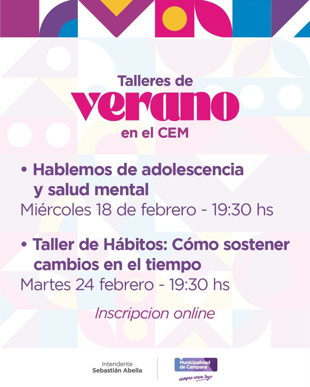 El miércoles 18 de febrero se dictará un taller referido a “Adolescencia y la salud mental” y, el martes 24, sobre “Hábitos: Cómo sostener cambios en el tiempo”. Ambos encuentros serán en el Centro Educativo Municipal y requieren inscripción previa.