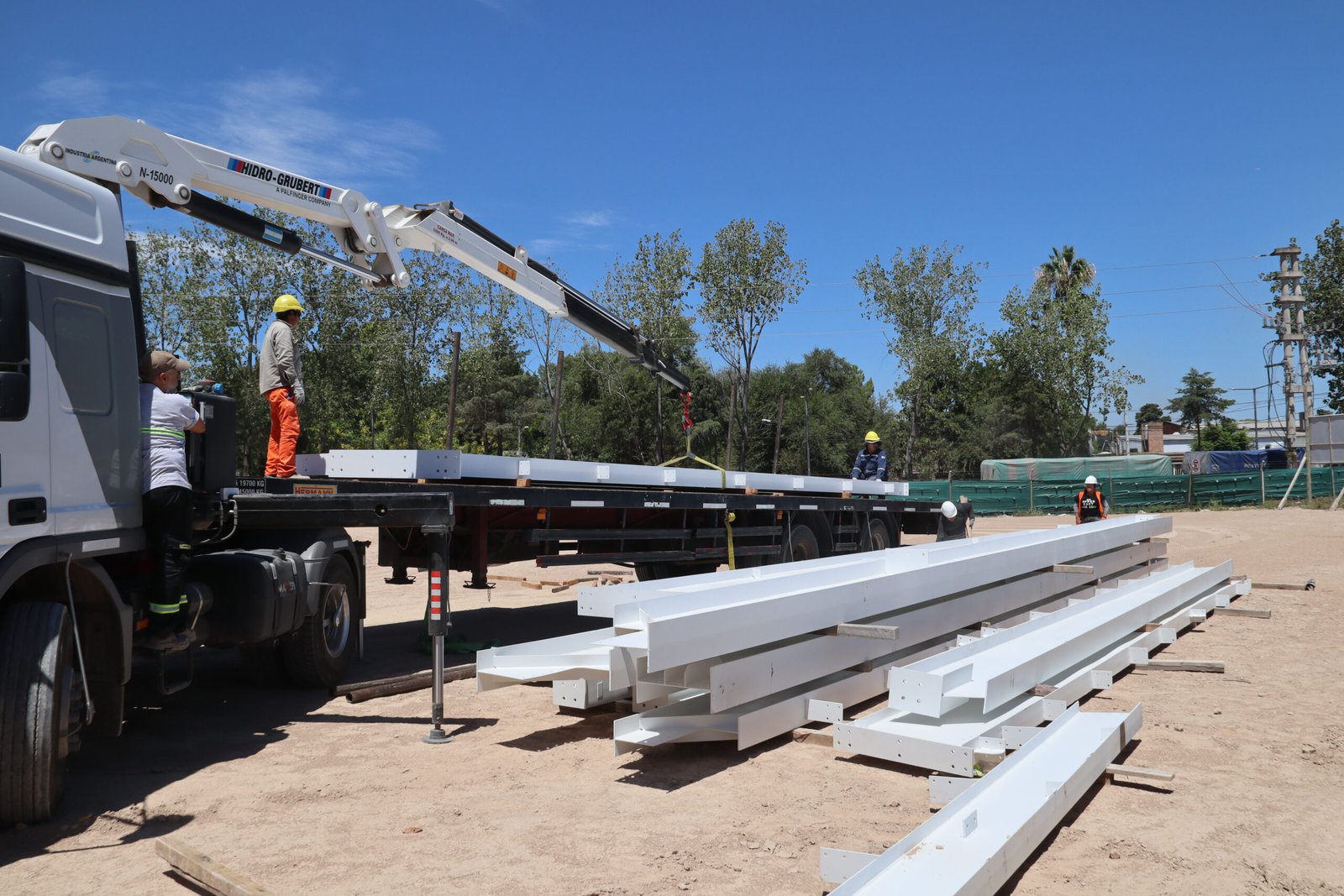 Y en la continuidad de la obra, mientras avanzan las tareas de mampostería, esta semana llegaron las columnas y las vigas metálicas que conformarán la nave principal del microestadio que tendrá 4.000 metros cuadrados.