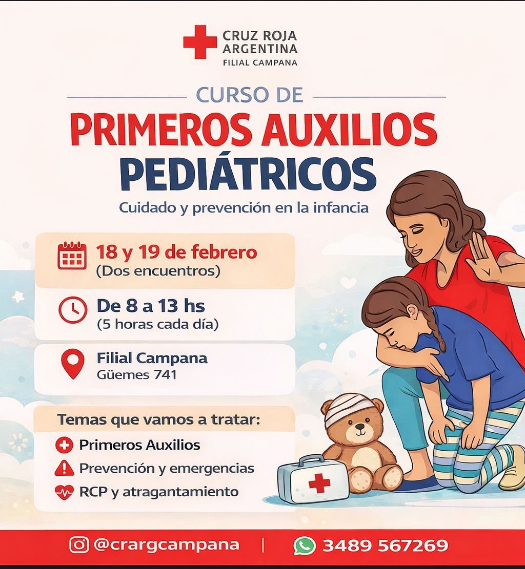 Con el objetivo de brindar herramientas fundamentales para actuar ante situaciones de emergencia que involucren a niños y bebés, la filial local de la Cruz Roja Argentina invita a participar del Curso de Primeros Auxilios Pediátricos, una capacitación clave para madres, padres, docentes y toda persona que esté al cuidado de menores.