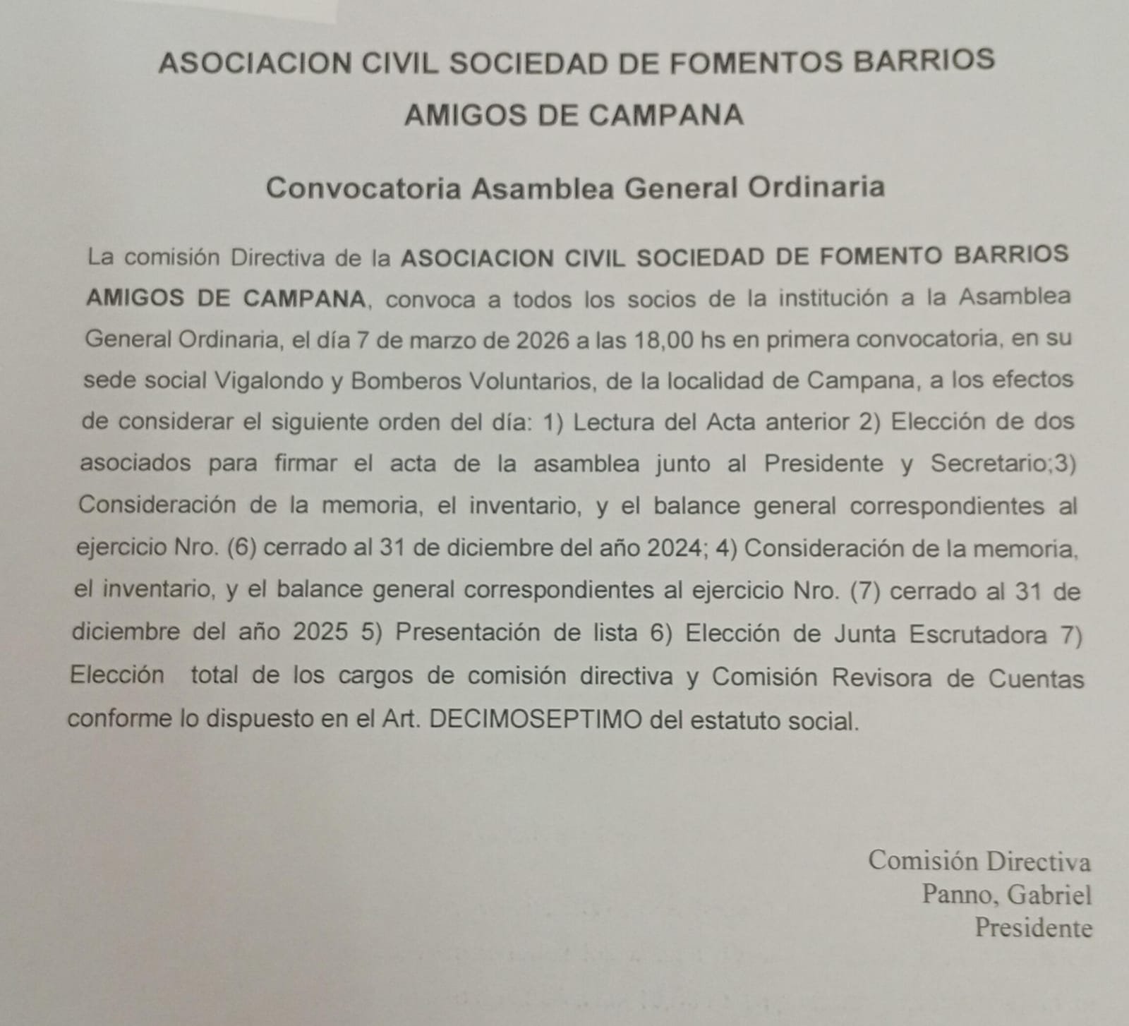 Convocatoria Asamblea General Ordinaria de la Asociación Civil Sociedad de Fomento Barrios Amigos de Campana a. ultimas noticias Comercio e industria 17 de febrero de 202618 de febrero de 2026mariano