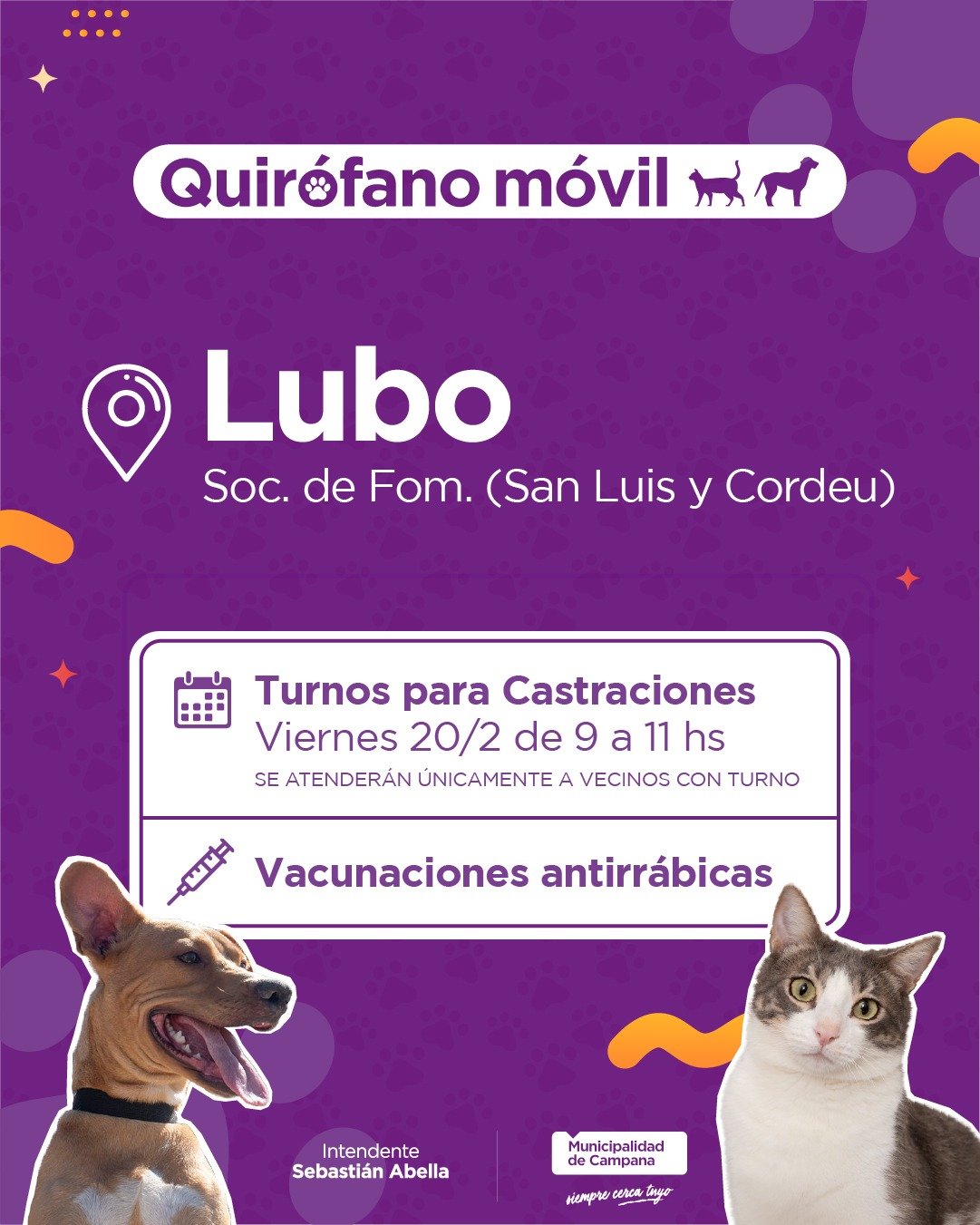 Los vecinos del lugar que quieran llevar a sus mascotas deberán retirar un turno este viernes 20 de febrero, de 9 a 11, en la sociedad de fomento en San Luis Cordeu. Los mismos se otorgarán para los días subsiguientes y los interesados deberán concurrir con DNI.