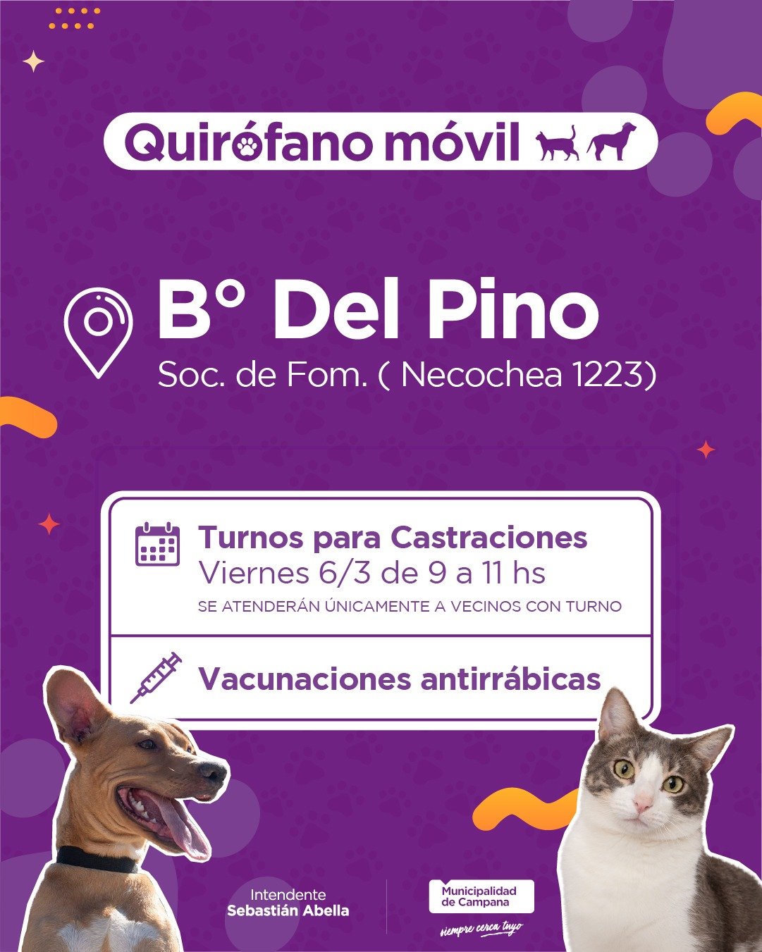 El quirófano móvil del Municipio estará en el barrio Del Pino para realizar castraciones y vacunación antirrábica de manera gratuita a perros y gatos, informaron desde Dirección General de Calidad Ambiental, Bromatología y Zoonosis.