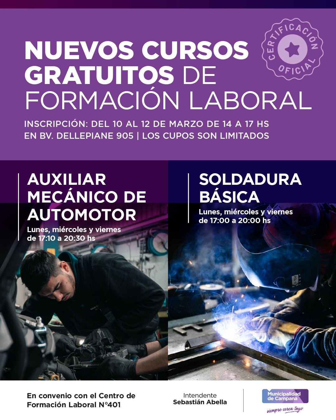 A partir de un convenio con el Centro de Formación Laboral N° 401, en esta oportunidad se dictará Soldadura Básica y Auxiliar Mecánico de Automotor.