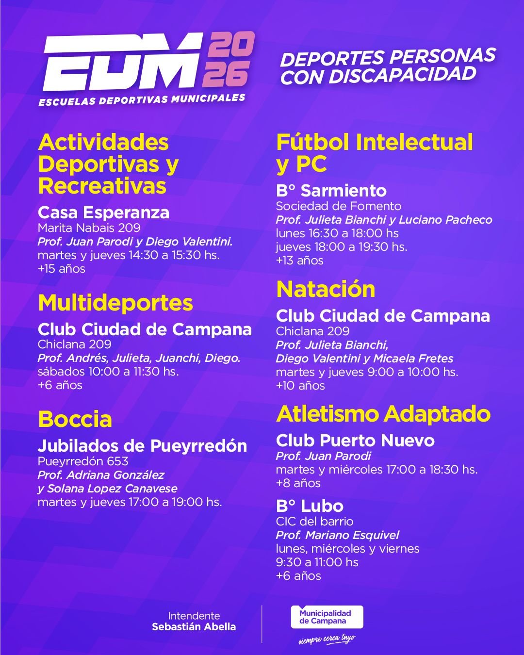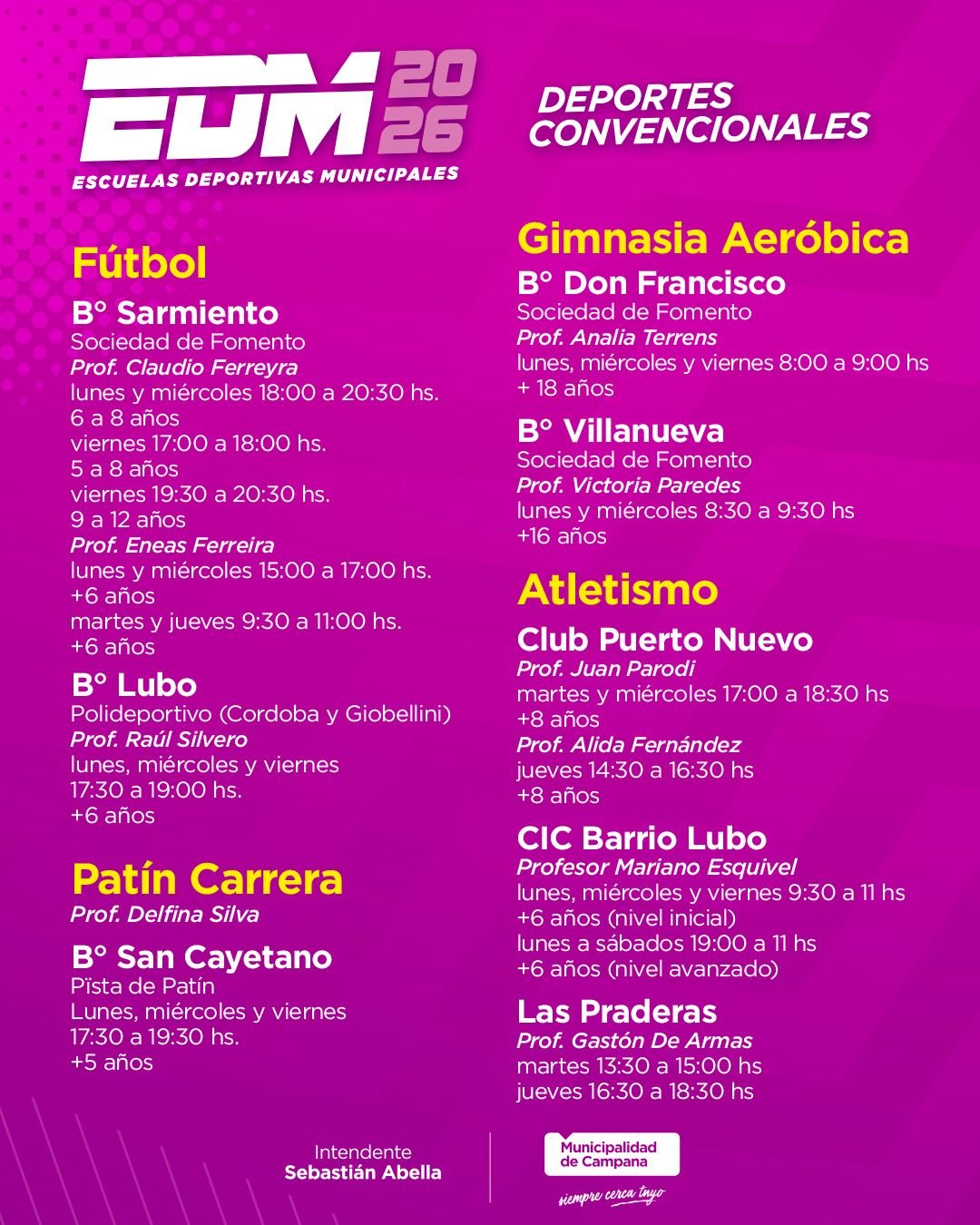 Las actividades deportivas se dictan de forma anual desde el 16 de marzo al 19 de diciembre. Todas las escuelas iniciarán en esa fecha, a excepción de aquagym y natación para personas con discapacidad que comenzarán el 6 de abril, y atletismo en el barrio Lubo, cuyo inicio está previsto para el 13 de abril.