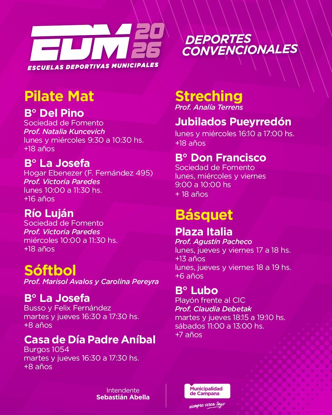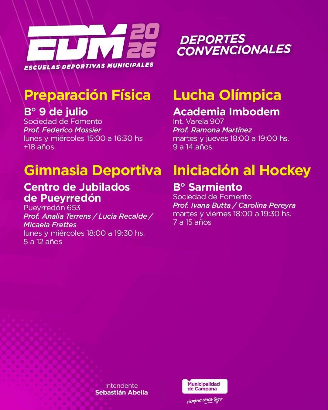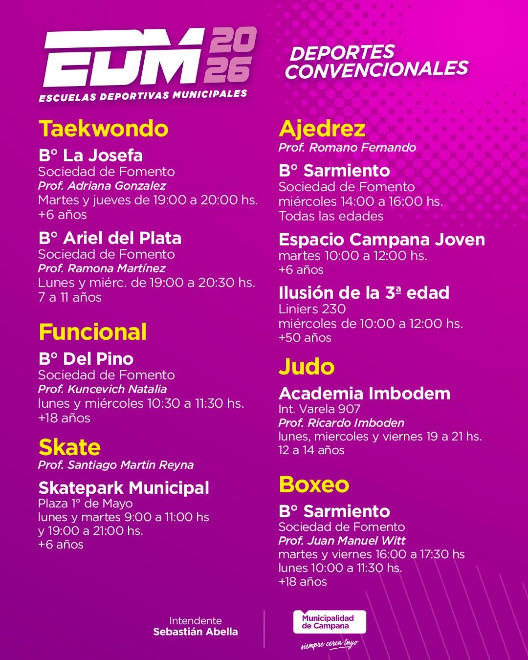 • Polideportivo Lubo (Córdoba y Giobellini, Lubo): lunes, miércoles y viernes 17:30 a 19 horas. Edad: + 6 años. Profesor Raúl Silvero.