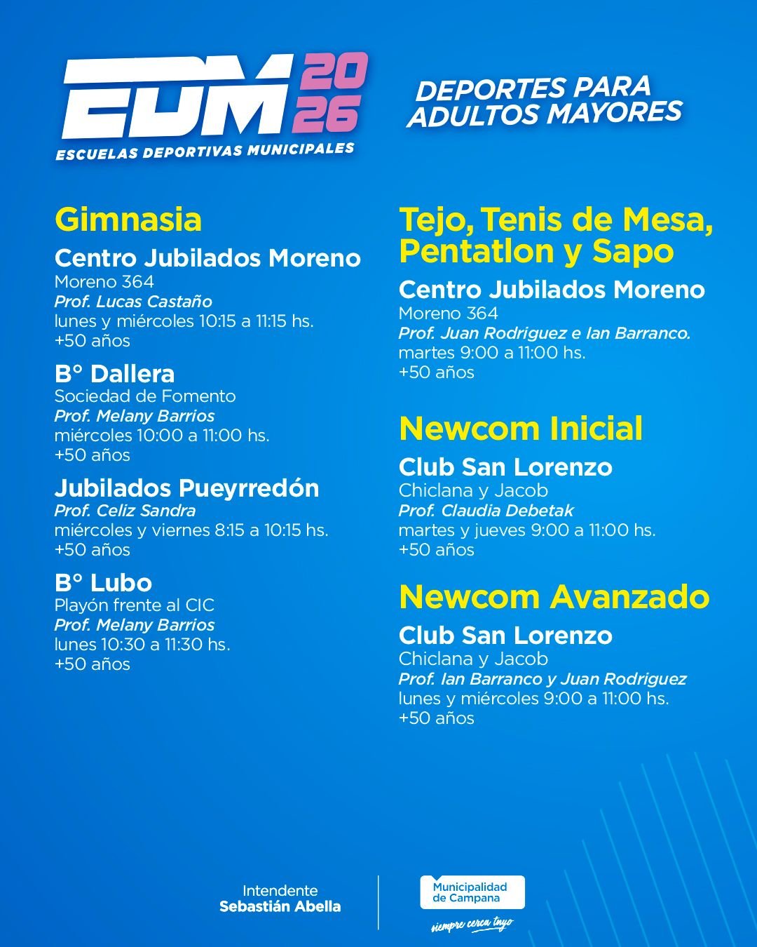 • Club San Lorenzo (Chiclana y Jacob, centro): lunes y miércoles 9 a 11 horas. Edad: + 50 años. Ian Barranco y Juan Rodríguez.