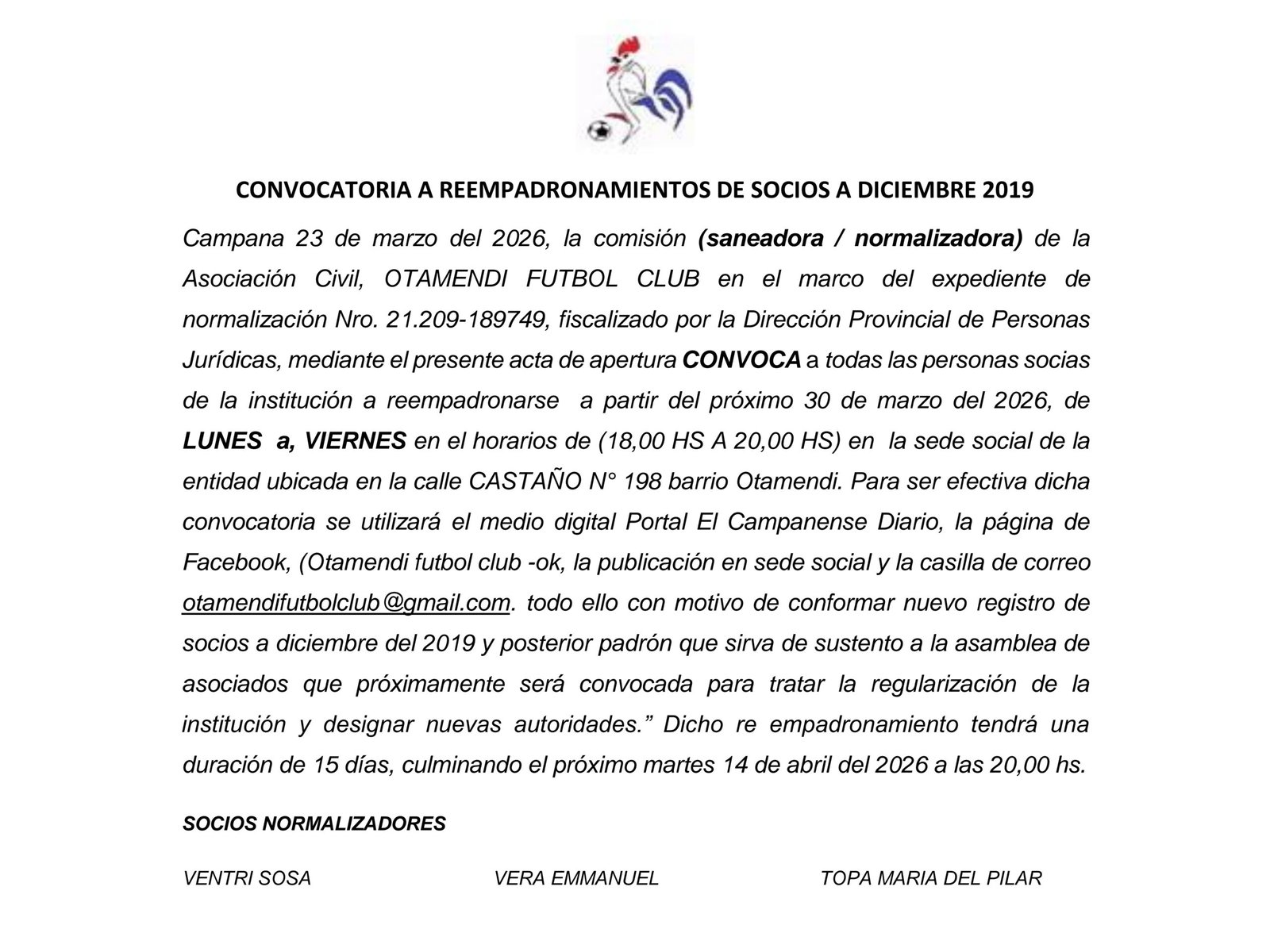 Otamendi FC: Convocatoria a reempadronamiento de socios a. ultimas noticias Convocatoria/edictos 23 de marzo de 2026mariano