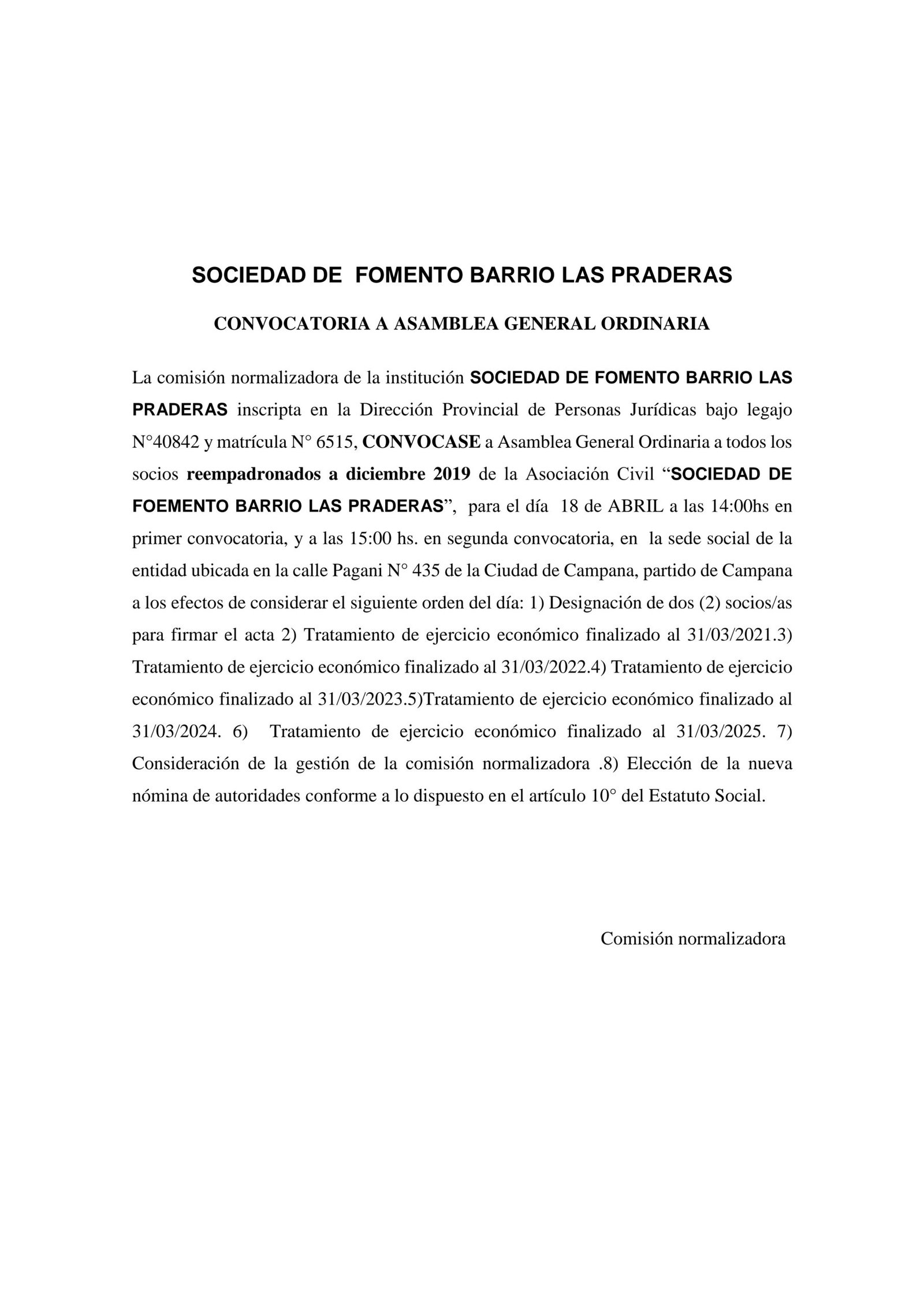 Sociedad de Fomento barrio Las Praderas: Convocatoria a Asamblea General Ordinaria a. ultimas noticias Convocatoria/edictos 27 de marzo de 2026mariano