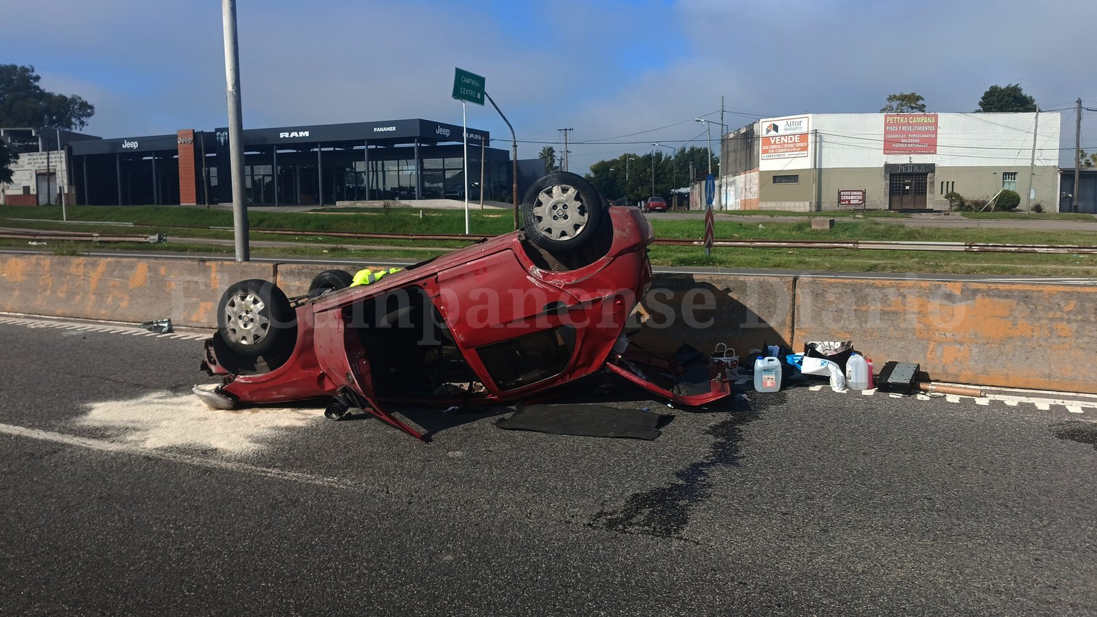 En el primero de ellos un automóvil Suzuki Fun pierde el control, vuelca y termina quedando sobre el carril rápido de la autopista, dejando el saldo de dos personas heridas que fueron trasladadas al hospital municipal San José.