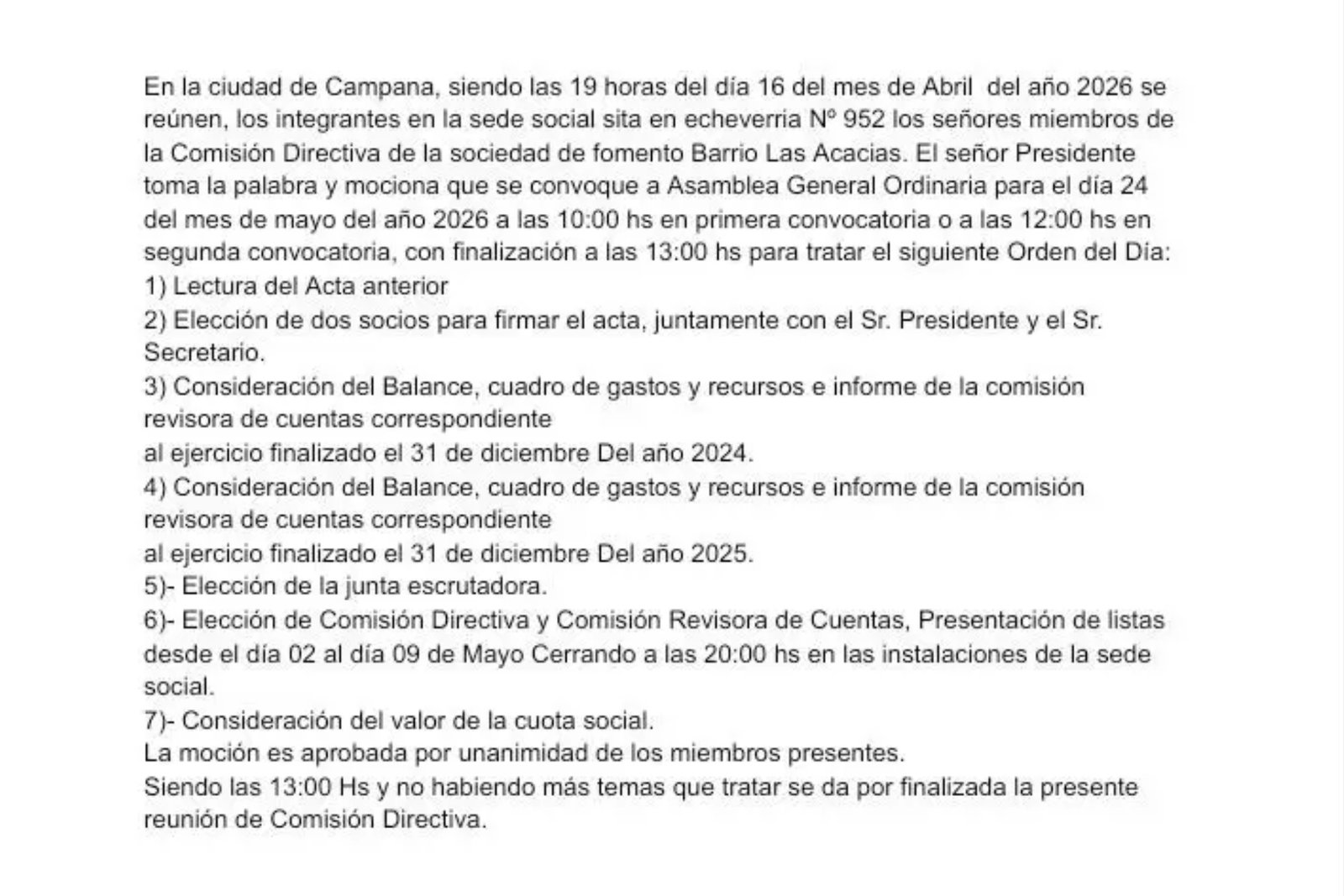 • Sociedad de Fomento barrio Las Acacias: Convocatoria a Asamblea General Ordinaria