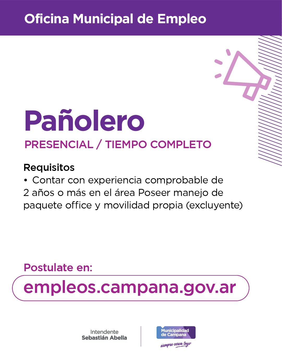 Las personas que cumplan con los requisitos deberán postularse a través de https://empleos.campana.gov.ar/jobs/148